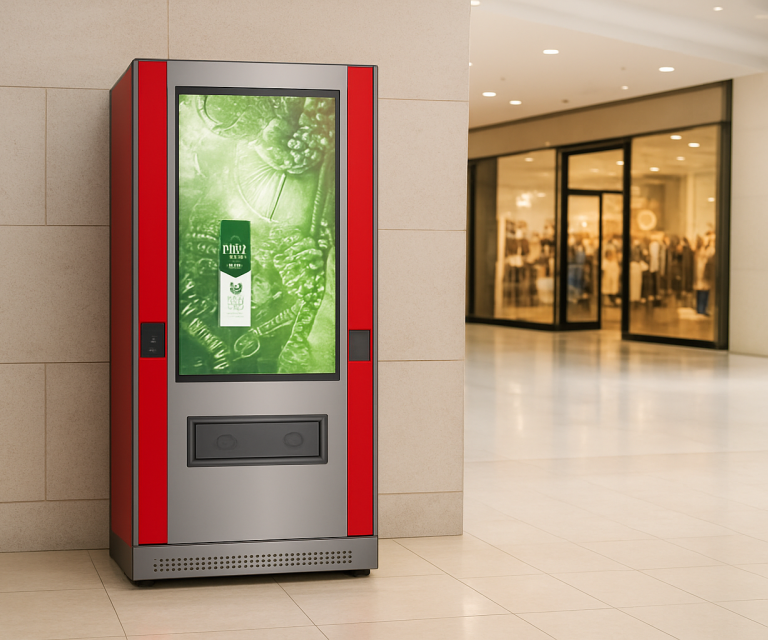 Der MaxX Safety verfügt über großflächige, symmetrisch angeordnete Screens, die einen eleganten und modernen Eindruck vermitteln. Auf diesen Bildschirmen lassen sich gezielt Werbeinhalte platzieren. Besonders effektiv kommen die Automaten neben den Apotheken in modernen Fitnessstudios zum Einsatz, wo sie sowohl Funktionalität als auch visuelle Präsenz optimal verbinden. So bringt Ihnen der MaxX Safety zwei getrennte Einnahmequellen – eine durch den Verkauf der Produkte in der Maschine und die andere durch den Verkauf von Bildschirmflächen an Werbetreibende.