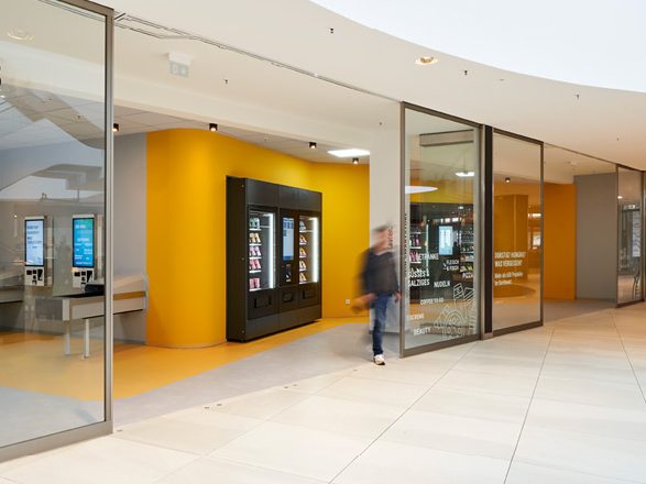 In der Libori Galerie in Paderborn betreiben wir einen modernen Inhouse-Smart-Store auf einer Fläche von rund 170 Quadratmetern. Hinter einer eleganten Wandkonstruktion befinden sich 14 Systemschränke sowie ein Tabakwarenautomat, die gemeinsam ein Sortiment von rund 650 verschiedenen Artikeln und bis zu 9.000 Produkten bereitstellen.